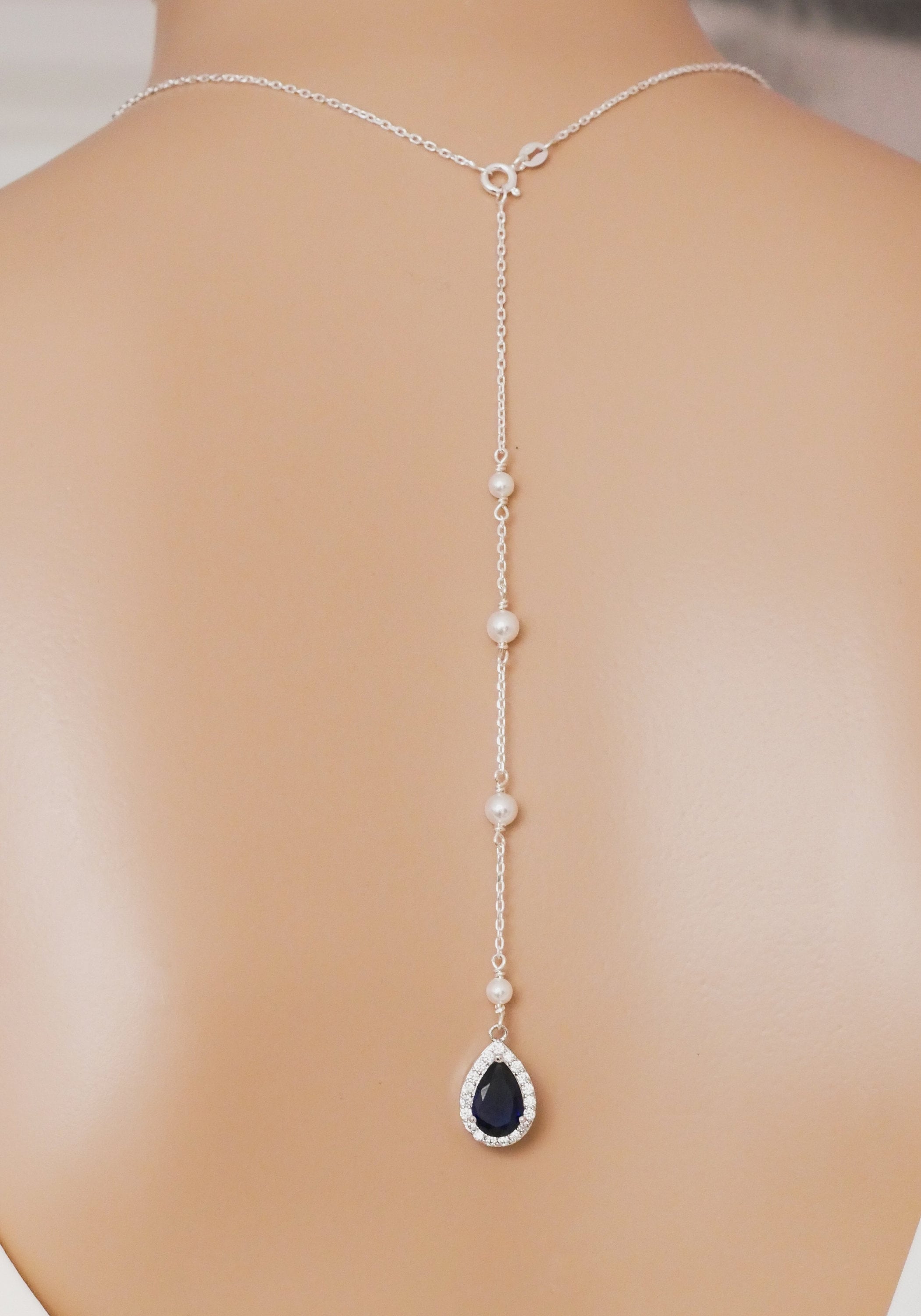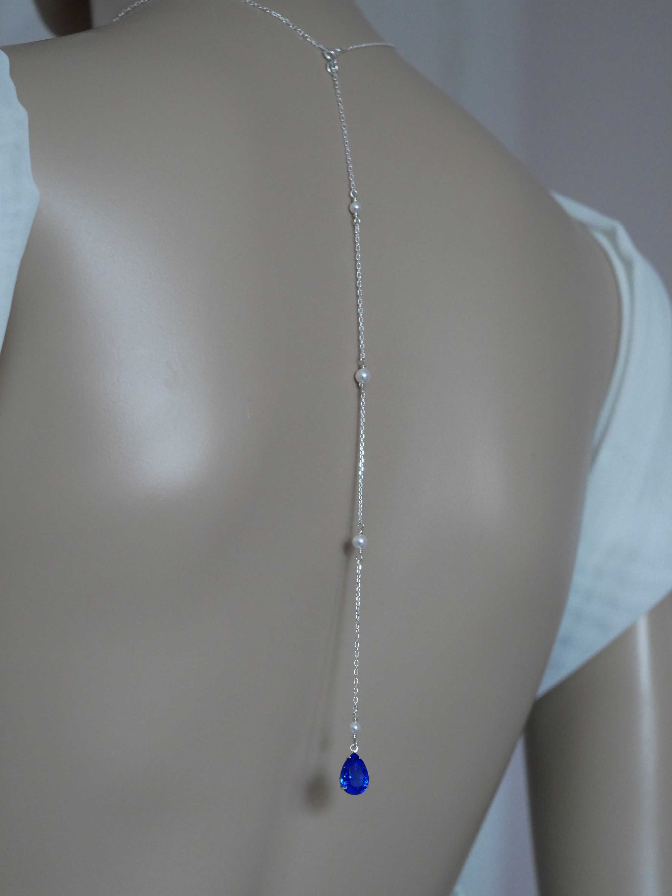 Backdrop necklace measurements are taken from the nape of your neck down to where you’d like the drop to sit. One piece backdrop chains fit over your head and the v section sits approximately 6” from the nape of your neck.