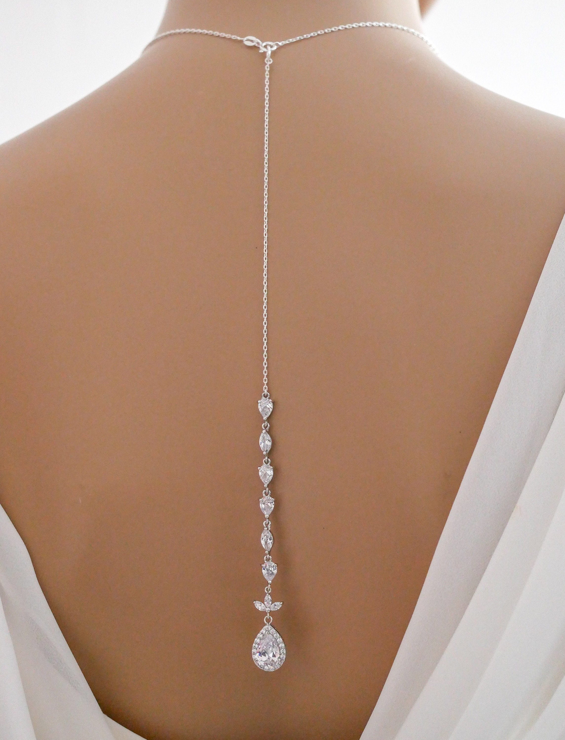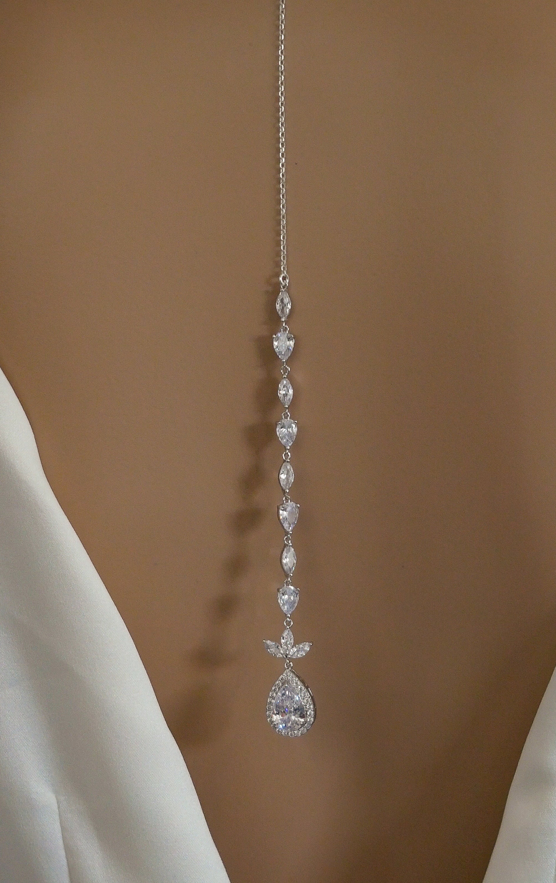 Backdrop necklace measurements are taken from the nape of your neck down to where you’d like the drop to sit. One piece backdrop chains fit over your head and the v section sits approximately 6” from the nape of your neck.