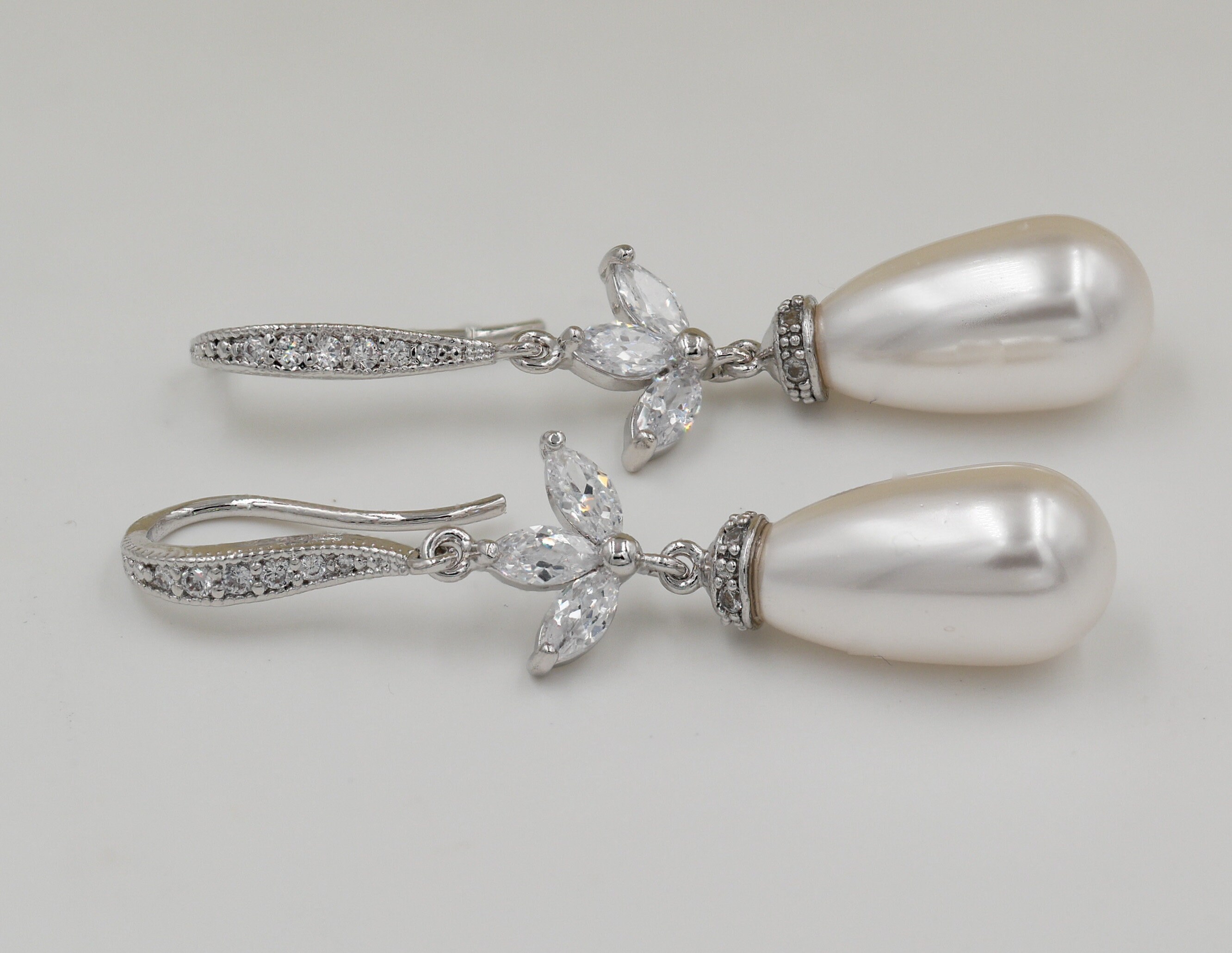 The back detail has a leaf cubic zirconia in the centre and a further 2 crystals or pearls on the single drop